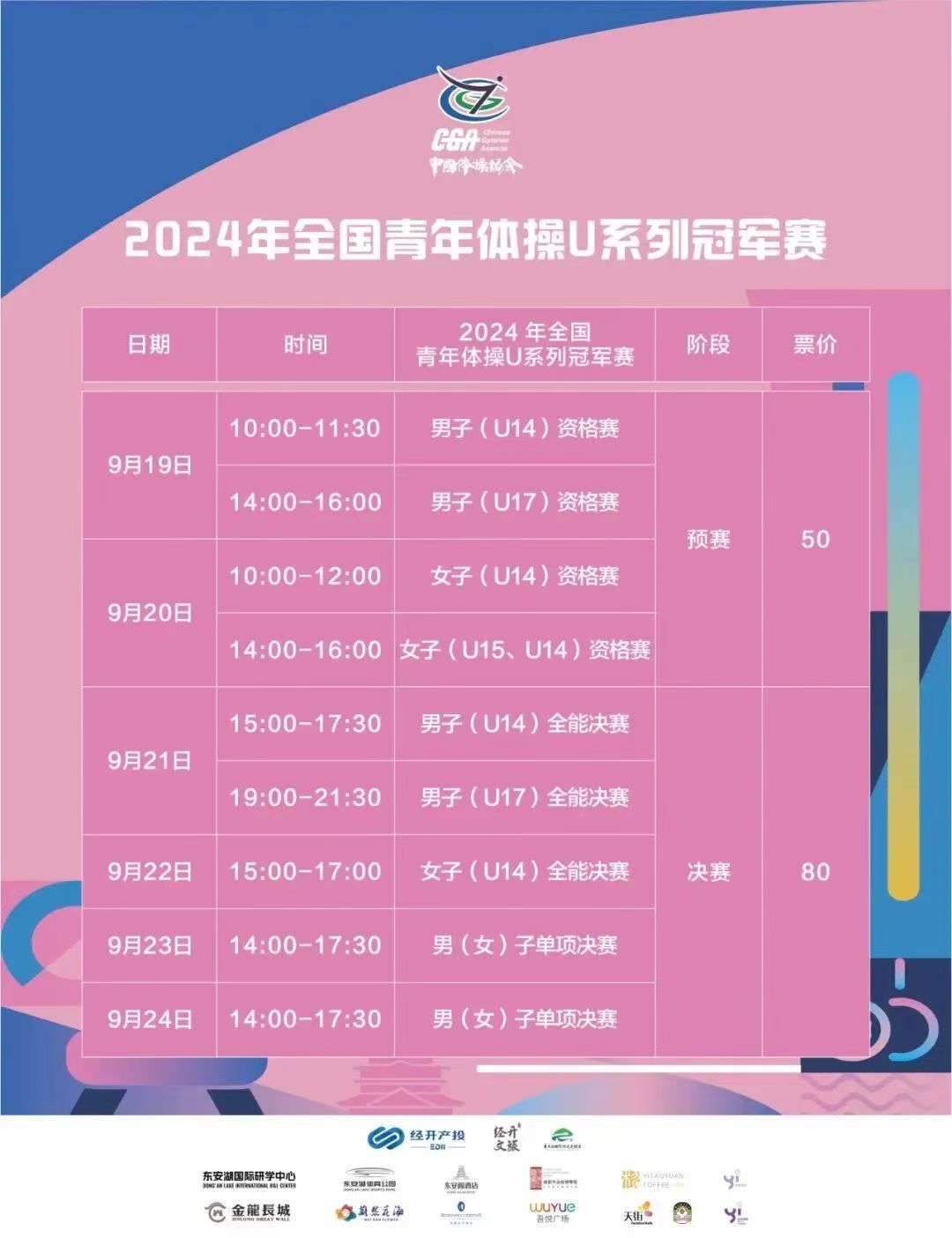 根据赛程,2024年全国体操冠军赛9月15日开赛,迎来全国各地23支队伍及一支个人队伍的约180名运动员参赛,领队、教练及随队人员153人。2024年全国青年体操u系列冠军赛共有来自国内19支队伍的约86名运动员参赛,领队、教练及随队人员91人。