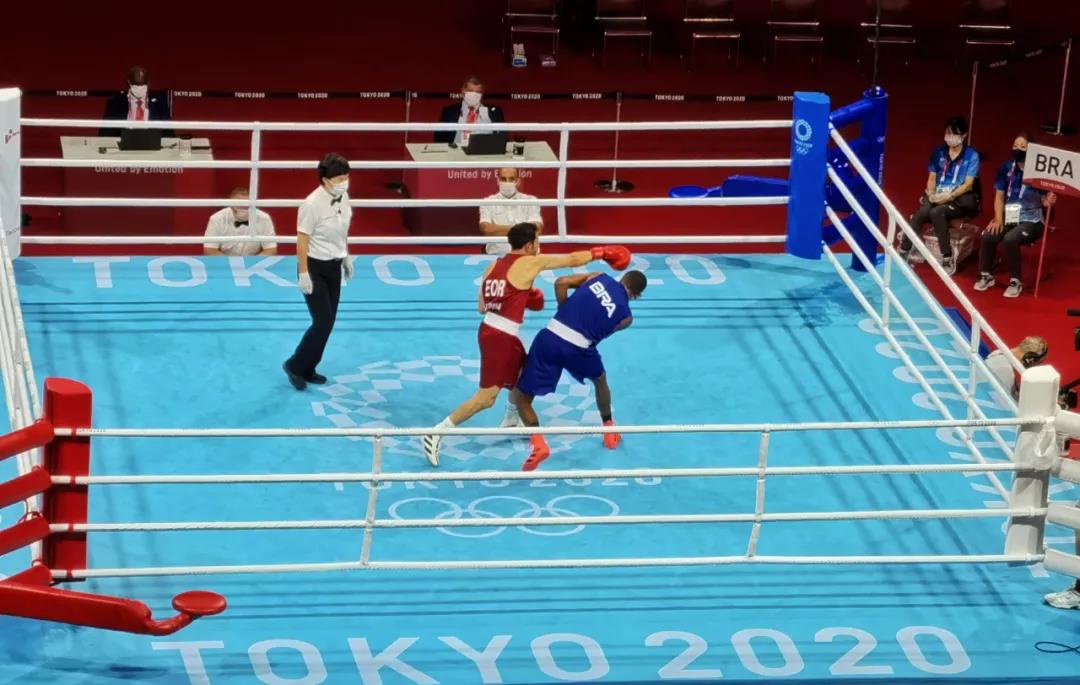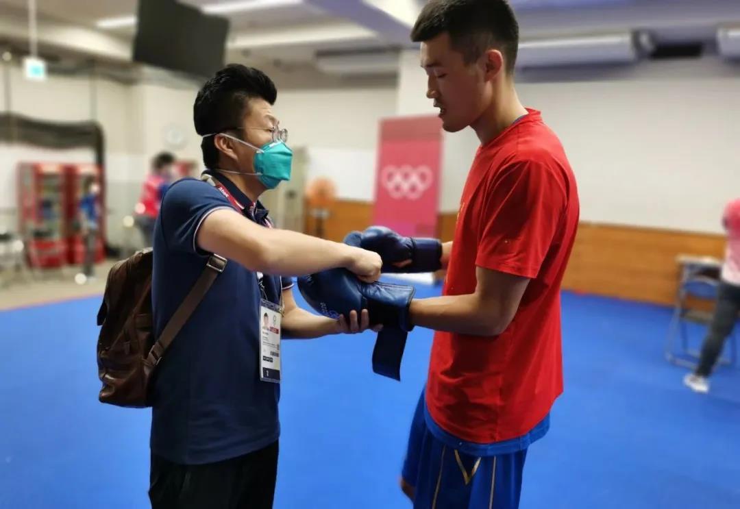 东京奥运会拳击热身馆,pg电子 工作人员帮助运动员穿戴拳击手套